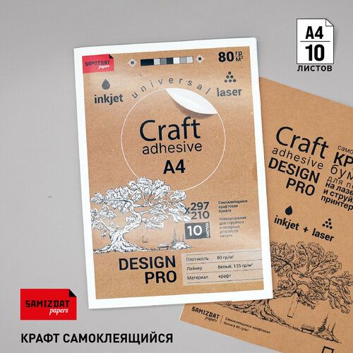 Крафтовая самоклеящаяся бумага, для печати этикеток и наклеек на струйных и лазерных принтерах. Красивый бежевый натуральный цвет, без красноты или желтизны. Теплый и бархатистый, идеально ровный и плотный крафт. Прекрасен для этикеток натуральных или авторских handmade продуктов, пригодиться в скрапбукинге и рукоделии. Обтянуть коробку или обложку, сделать тираж этикеток или наклеек на что угодно. Верхний слой – натуральный крафт плотностью 80 гр/м2 с клеевым слоем, клей постоянный. Нижний слой (подложка) из глассина плотностью 135 гр/м2 Бумага без покрытия, печать на струйном принтере по оттиску близка к обычной офсетной бумаги. Лазерная печать на крафте возможна при соблюдении ряда условий. Ваше лазерное устройство должно быть изначально предназначено для печати на плотных дизайнерских материалах. Материал трехслойный, плотный, а значит и температура запекания тонера должна быть высокой. Если у вас небольшое лазерное устройство не выставляйте в драйвере режим печати этикетка или обычная, выберите режим для печати плотная или картон – это замедлит скорость прохождения через печку принтера и оттиск хорошо закрепиться. В остальном бумага термостабилизирована и прекрасно переносит «горячую» печать. Адгезия есть не только у клея, нанесенного на бумагу, есть еще адгезия у поверхности: слабая или сильная. Есть поверхности с такой слабой поверхностной адгезией, что никакой клей на ней не удержится. Учитывайте это при выборе тары для ваших товаров и этикеток. Материалы для этикеток бывают бумажные и синтетические (пленки). Крафт – бумажный материал, не берите его на этикетки продуктов с «мокрыми» перспективами. Если эксплуатация товара будет происходить во влажных условиях, печатайте этикетку на полипропиленовой или ПЭТ пленке. Все бумаги и пленки SamIzdat произведены по немецкой технологии на высокотехнологичном оборудовании. Термостабилизированы для лазерных принтеров. Материалы для пигментных чернил имеют специальное покрытие или пригодны к струйной печати без специального покрытия. Все материалы успешно прошли тестирование в российских типографиях и копи-центрах на различном цифровом оборудовании. Успехов в печати