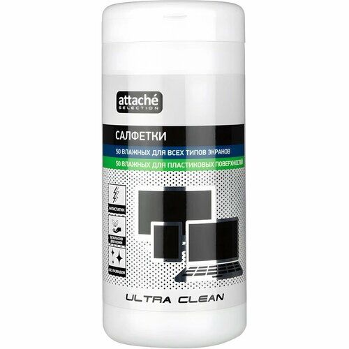 Очищающие салфетки Attache Selection Ultra Clean — туба содержит 50 влажных салфеток для чистки экранов и 50 влажных салфеток для чистки пластика. Предназначены для очистки всей офисной техники — как мониторов, так и оргтехники, в том числе всех поверхностей. Бережно очищают поверхности от пыли, грязи и отпечатков пальцев. Салфетки изготовлены из нетканого материала на основе целлюлозы, не оставляют разводов и ворса после очистки. Обладают длительным антистатическим эффектом, препятствуя пыли оседать на поверхности техники. Очищают поверхности не повреждая их.