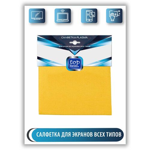 TOP HOUSE салфетка для ухода за экранами эффективно удаляет любые загрязнения (пыль, следы от кофе и пальцев, никотиновую пленку), снимает статическое электричество с любых экранов телевизоров, в том числе со светодиодной подсветкой (LED, OLED), плазменных панелей, мониторов, ноутбуков, смартфонов и планшетов, цифровых фоторамок. Размер салфетки - 34x40 см.