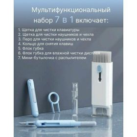 Многофункциональный набор для чистки гаджетов, клавиатуры и наушников 7 в 1. Аксессуары для чистки и детейлинга электроники 7 в 1 предназначены для чистки широкого спектра электронных устройств, так как набор вмещает в себя всё необходимое: 1. Щетка для чистки клавиатуры - 1 шт; 2. Щетка для чистки наушников и чехла - 1 шт; 3. Перо для чистки наушников и чехла - 1 шт; 4. Кольцо для снятия клавиш - 1 шт; 5. Флок губка – 1 шт; 6. Флок губка для влажной чистки дисплея - 1 шт; 7. Пустая мини-бутылочка с пульверизатором (без жидкости) - 1 шт. Большой набор для чистки электроники прост в использовании и подойдет для очистки беспроводных и проводных наушников, airpods, телефонов, планшетов, клавиатур, фотоаппаратов и других гаджетов. Эргономичный дизайн и компактный размер современного очистительного набора позволит носить его с собой: в сумке, портмоне или даже обычном кармане. Полезный набор для чистки электронных устройств бережно и эффективно очистит ваши любимые гаджеты в самых труднодоступных местах. Набор для чистки наушников и клавиатуры изготовлен из высококачественного пластика и работает деликатно, не повреждая поверхности. Удобная небольшая щетка высокой плотности быстро избавляет от пыли маленькие элементы, мягкая чистящая накладка, поможет очистить экран телевизора, монитора, мобильного телефона. Во флакон для чистящего средства можно добавить антисептик, обезжириватель и использовать как распылитель. Аккуратные наконечники, входящие в набор, удаляют загрязнения даже из самых недоступных отверстий в деталях смартфона или ноутбука. Тонкий кончик, которым снабжена мягкая силиконовая палочка– пролезет куда угодно. Широкая щетка очистит любую поверхность, проникая в самые укромные места, где любит скапливаться пыль. Также в комплект многофункционального набора входит приспособление для снятия клавиатурных кнопок. С таким набором для гаджетов ваш аксессуар всегда будет чистым и приятным в использовании Регулярная чистка продлит срок службы Вашего девайса. Набор для очистки электронных устройств станет отличным приобретением не только в личное пользование, но и в подарок близкому человеку, другу или коллеге.
