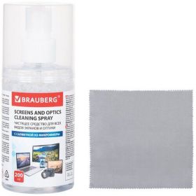 Чистящий набор BRAUBERG содержит спрей-очиститель с антистатической добавкой и многоразовую салфетку из микрофибры. Безворсовая салфетка не оставляет разводов, хорошо очищает экраны всех типов, стёкла, зеркала и пластиковые поверхности.