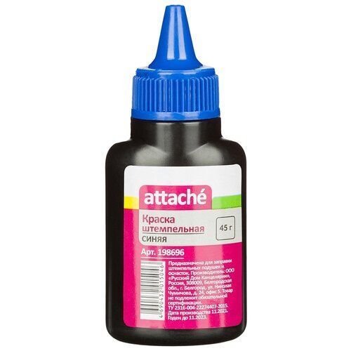 Краска штемпельная Attache синяя на водно-глицериновой основе. Объем флакона 45 г. Флакон снабжен дозатором, обеспечивающим равномерное нанесение краски на подушку. Назначение: для бумаги.
