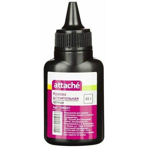 Краска штемпельная Attache черная на водной основе. Объем флакона 45 г. Флакон снабжен дозатором, обеспечивающим равномерное нанесение краски на подушку. Назначение: для бумаги.