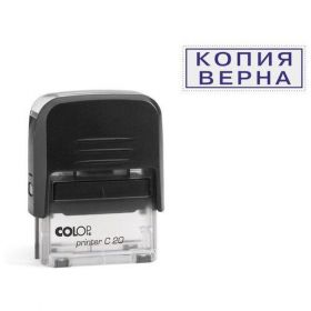 Штамп стандартный Colop Printer C20 3.45 позволяет получить оттиск со словами 'копия верна'. Выполнен в современном дизайне. Компактный надежный пластиковый корпус с поворотным окрашивающим механизмом. Размер оттиска - 38x14 мм. Прозрачное основание позволяет удобно и точно размещать штамп на документах. Комплектация: штамп, синяя сменная штемпельная подушка E/20. Внимание Все сменные штемпельные подушки, которыми комплектуется продукция Colop, заправлены краской Noris (Германия) на водной основе с добавлением глицерина и предназначены для проставления оттисков на бумагу и пористые поверхности. При необходимости проставления оттисков спиртсодержащей краской при помощи автоматической оснастки, стандартную подушку, идущую в комплекте, необходимо заменить на специальную совместимую со спиртосодержащими красками, во избежание затвердевания подушечного материала. Заказывается индивидуально.