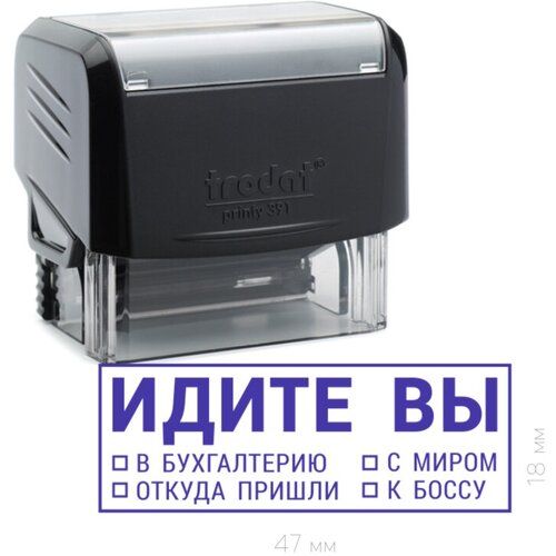 Штамп на автоматической оснастке с фразой "шутка Идите вы", для документов. Штамп оснащен автоматической оснасткой со встроенной штемпельной подушкой для удобного использования в повседневной работе. Размер оттиска 47х18 мм. Штамп для документов, печать синяя. Штамп не самонаборный с оттиском синего цвета значительно экономит ваше время при просмотре и контроле документов и проставлении в них отметки. Корпус автоматической печати для документов изготовлен из прочного, износостойкого пластика. Сверху под прозрачным пластиком указан образец оттиска для быстрой идентификации в процессе эксплуатации. Механический корпус штампа удобен в использовании, обеспечивает четкий, заметный оттиск и готов служить годами при ежедневном применении без потери качества, целостности. Прочные фиксаторы по бокам исключают подвижность штампа датера, делают его статичным и служат для транспортировки, замены и дозаправки штемпельной подушки. Замена подушки ручного штампа занимает менее 1 минуты всего несколько жестов и печать готова выполнять свою основную задачу. Вам не придется самостоятельно вручную набирать необходимый текст: штамп квадратный уже готов к использованию. При необходимости приобрести другой оттиск, рекомендуем выбрать из предложенных в ассортименте нашего магазина. Мы реализуем высококачественные печати для документов: датеры с цифрами, датеры с буквами, штампы датеры, печать датеры, нумераторы, печати с разными оттисками. Гарантируем долговечность офисного канцелярского товара. При доставке канцтовар офисный упаковывается в прочную упаковку, подходящую для транспортировки к клиенту, для сохранения целостности товара.