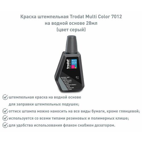 Штемпельная краска Trodat 7012 на водной основе для первичной заправки штемпельных подушек. Используется для всех видов бумаги, кроме глянцевой. Не содержит спирт, не портит печати из полимера и силикона. Удобная индикация уровня заполнения чернилами благодаря прозрачной полоске. Контроль дозирования чернил благодаря оптимизации носика. Гибкая конструкция бутылочки, позволяющий легче ее сжимать. Объем - 28 мл