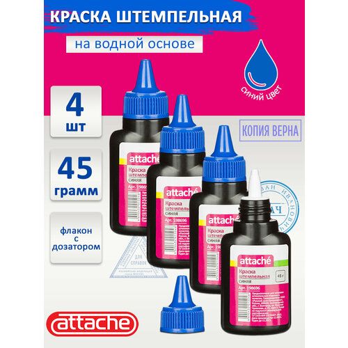 Краска штемпельная Attache 45 гр 4 флакона в наборе. Чернила для печатей хорошо впитываются и отличается высоким качеством. Краска штемпельная Attache синяя на водной основе. Объем флакона 0,125 литра. Флакон снабжен дозатором, обеспечивающим равномерное нанесение краски на подушку. Назначение: для бумаги.