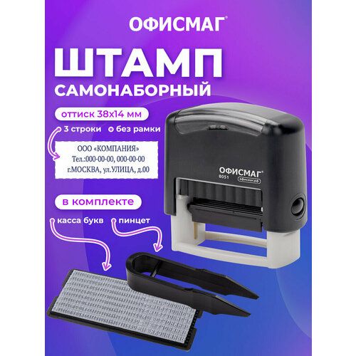 Найти - Печать самонаборная канцелярская, штамп самонаборный 3-строчный, касса букв и цифр, оттиск 38х14 мм, Офисмаг Printer 8051, 271923