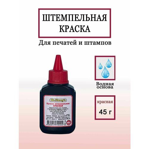 Краска штемпельная 45 г на водной основе предназначена для заправки штемпельных подушек, используемых для всех видов печатей, штампов, нумераторов и датеров. Краска для печатей имеет такие характеристики как: резкость контуров и пригодность для проставления на документах. Оттиск штампа можно наносить на все виды бумаги, кроме глянцевой. Время высыхания оттиска - 30 секунд. Флакон с высококачественными чернилами снабжен дозатором, обеспечивающим аккуратное и равномерное нанесение краски на штемпельную подушку