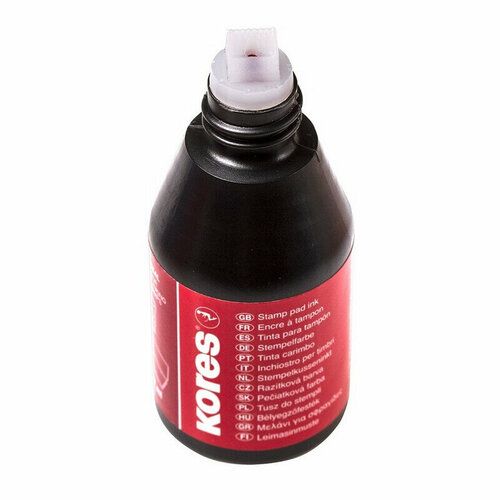 Штемпельная краска Kores на водно-масляной основе в пластиковом флаконе объемом 28 г. Цвет синий. Дозатор обеспечивает равномерное нанесение на штемпельную подушку. Подходит для использования со всеми видами резиновых штампов.