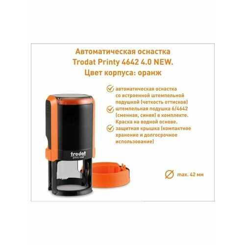 Оснастка Trodat Printy 4642 самая новая среди всех существующих оснасток. Печать на оснастке Trodat Printy 4642 - лёгкая, компактная и прочная. Преимущества оснастки Trodat Printy 4642:- рассчитана на длительное использование (оснастки защищены ламинацией-покрытие долговечно, устойчиво к истиранию, мелким царапинам, влажности рук);- сокращены логистические расходы (оптимизирован вес и размер оснастки, наличие защитной крышки);- металлический стержень укрепляет всю конструкцию и не даёт оснастке перекашиваться или заклинивать. Тродат - это крупнейший производитель оснасток для печатей и штампов в мире, ставший лидером по выпуску лучшей автоматической оснастки с механизмом встроенной штемпельной подушки. Высокое качество изделий подтверждает международный сертификат ISO 9001.