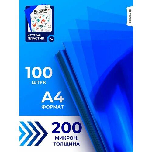 Обложки для переплета прозрачные пластиковые гелеос, А4, 0.2 мм, синие , 100 шт.