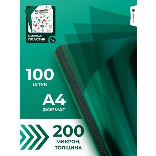 Обложки для переплета прозрачные пластиковые гелеос, А4, 0.2 мм, зеленые , 100 шт.