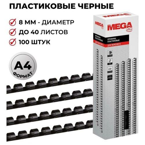 Пружины для переплета пластиковые ProMega office предназначены для сшивания до 40 листов формата А4 при помощи брошюровщика. Позволяют вынимать и добавлять листы в готовый документ. Изготовлены из прочного пластика черного цвета, состоят из 21 кольца диаметром 8 мм, шаг переплета — 3:1. Поставляются по 100 штук в упаковке.