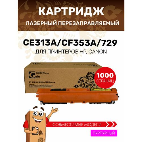 Универсальный совместимый лазерный картридж CE313A / CF353A / 729 пурпурного цвета подходит для принтеров HP Color LaserJet Pro M175 / M175a / M175nw / M275 / M275nw / CP1020 / CP1025 / CP1025nw / CM176 / CM176n / CM177 / CM177fw / Canon i-SENSYS LBP7010 / LBP7018 / LBP7010C / LBP7018C . При производстве расходных материалов GalaPrint используются только качественные комплектующие. Картриджи GalaPrint не уступают оригинальным, полностью совместимы с заявленными моделями принтеров, обеспечивают естественную цветопередачу и хорошее качество печати. Важно. Производитель имеет право, не уведомляя заказчика, вносить изменения в конструкцию и комплектацию картриджа, без ухудшения его потребительских свойств. В случае наличия оранжевых транспортировочных фиксаторов, защитных крышек, шторок и чеки/запорной ленты их нужно извлекать. Ресурс картриджа составляет - 1000 страниц формата А4 при 5% заполнении страницы.