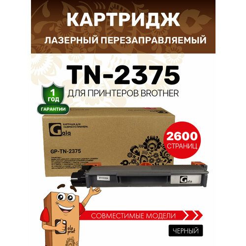 Cовместимый лазерный картридж TN-2375/TN-2335 подходит для принтеров Brother DCP-L2500 / DCP-L2500DR / DCP-L2520 / DCP-L2520DWR / DCP-L2540 / DCP-L2540DNR / DCP-L2560 / DCP-L2560DWR / HL-L2300 / HL-L2300DR / HL-L2340 / HL-L2340DWR / HL-L2360 / HL-L2360DNR / HL-L2365 / HL-L2365DWR / HL-L2380 / MFC-L2700 / MFC-L2700DWR / MFC-L2700DNR / MFC-L2720 / MFC-L2720DWR / MFC-L2740 / MFC-L2740DWR . При производстве расходных материалов GalaPrint используются только качественные комплектующие. Картриджи GalaPrint не уступают оригинальным, полностью совместимы с заявленными моделями принтеров, обеспечивают естественную цветопередачу и хорошее качество печати. Важно. Производитель имеет право, не уведомляя заказчика, вносить изменения в конструкцию и комплектацию картриджа, без ухудшения его потребительских свойств. В случае наличия оранжевых транспортировочных фиксаторов, защитных крышек, шторок и чеки/запорной ленты их нужно извлекать. Ресурс - 2600 страниц формата А4 при 5% заполнении страницы.