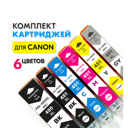 Данный комплект состоит из 6 картриджей PGI-450PGBK XL - черный, CLI-451BK XL - фото-черный, CLI-451C XL - голубой, CLI-451M XL - пурпурный, CLI-451Y XL – желтый, CLI-451GY XL – серый.