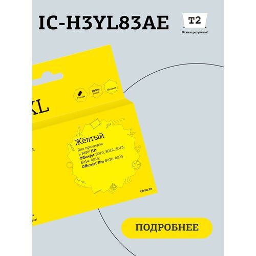 Струйный картридж T2 IC-H3YL83AE для принтеров HP, желтый (yellow). Подходит для принтеров: HP Officejet 8010, HP Officejet 8012, HP Officejet 8013, HP Officejet 8014, HP Officejet 8015, HP Officejet Pro 8020, HP Officejet Pro 8023. Как производитель картриджей, мы гарантируем заливаемый объем чернил, который соответствует заливаемому производителем печатающего устройства. Высокое качество используемых материалов делает оттиск чётким и долговечным. Специальная конструкция предотвращает утечку краски. Все струйные картриджи Т2 протестированы по стандартам STMC и ISO. В повседневной работе проявляют себя не хуже оригинальных. Фирменные чернила позволяют получить детализованные отпечатки на бумаге - краска не растекается и не допускает смазывания изображения.