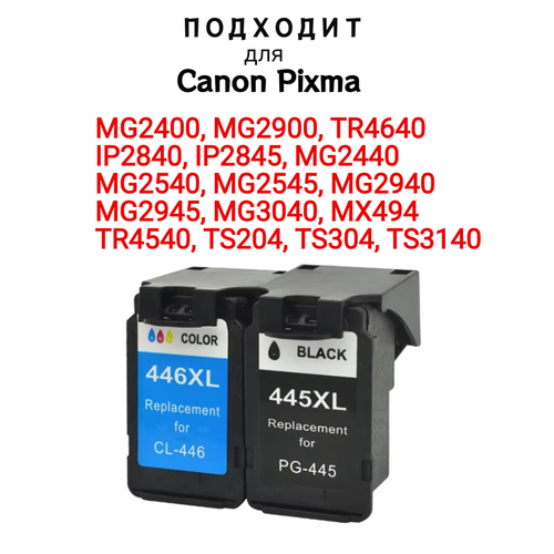 Картридж эксплуатируется в следующих моделях принтеров и МФУ: Canon Pixma TS3340, IP2840, IP2845, MG2400, MG2440, MG2540, MG2545, MG2900, MG2940, MG2945, MG3040, MX494, TR4540, TS204, TS300, TS304, TS3100, TS3140, TS3340, TR4640 . Ресурс комплекта около 400 страниц при 5% заполнении листа А4. Совместимые картриджи для Canon 445XL и 446XL изготовлены на заводе из новых комплектующих снабжены чипом для контроля красителя, заправлены качественными чернилами и наделены гарантией производителя. Приобретая комплект картриджей для Canon 445XL+446XL у нас будьте уверены, что приобрели качественный товар по выгодной цене.