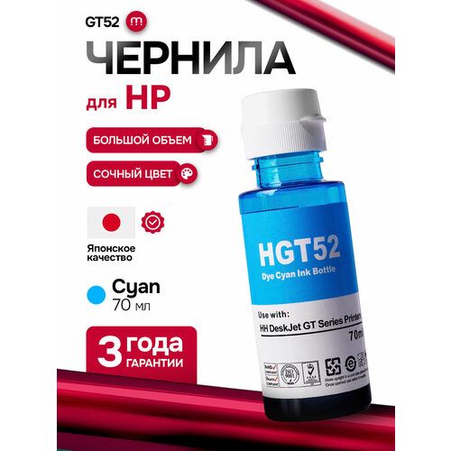 Голубые (Cyan) чернила GT52 в флаконе 70 мл предназначены для заправки принтеров и МФУ со встроенными перезаправляемыми контейнерами HP: