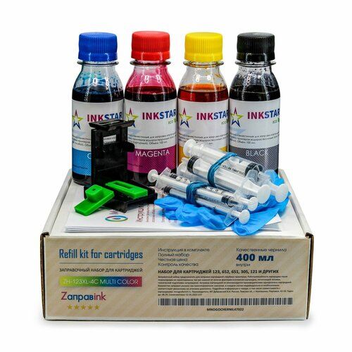 Экономичный заправочный набор (комплект) ZH-123XL-4C с чернилами 4 цветов по 100 мл позволяет легко в домашних условиях самостоятельно дозаправить картриджи 305 / 305XL - черный и цветной - для принтеров и МФУ HP DeskJet 2320, 2710, 2720, 2721, 2723, HP DeskJet Plus 4120, 4130, 4122. Чернильницы этих аппаратов можно дозаправить, если они исправны и не засохли. Лучше заполнить их при уровне чернил 10-15%, а не ждать полного окончания краски (когда картридж не печатает) - в таком случае результат будет лучше. В наборе - краски 4 цветов по 100 мл: cyan, magenta, yellow, black.