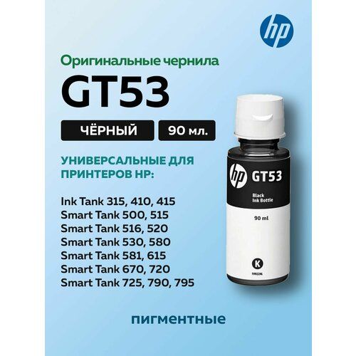 Чернила для струйного принтера HP GT53 (оригинал). Подходит для принтеров: Ink Tank 315, Ink Tank Wireless 410, Ink Tank Wireless 415, Smart Tank 500, Smart Tank 515 AiO, Smart Tank 516, Smart Tank 520, Smart Tank 530 AiO WL, Smart Tank 580, Smart Tank 581, Smart Tank 615, Smart Tank 670, Smart Tank 720 All-in-One, Smart Tank 725 All-in-One, Smart Tank 790 All-in-One, Smart Tank 795