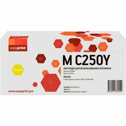Картридж Easyprint LR-MC250H Y предназначен для использования в принтерах Ricoh M C250FW и P C301W. Он обеспечивает высокое качество печати и позволяет получить до 6300 страниц текста или изображений.