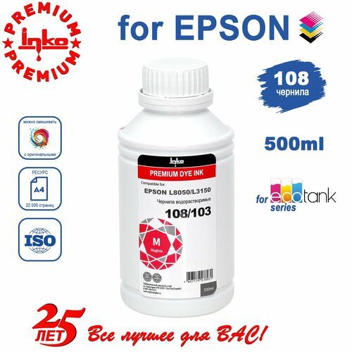 Чернила для Epson 108 краска для принтеров L8050, L8058, L18050, L18058 500 мл пурпурные 103779457454