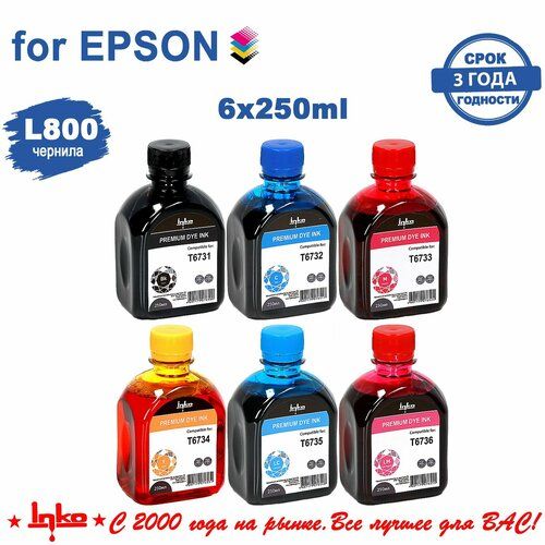 Водорастворимые чернила для принтеров Epson L800, L810, L850, L1800, комплект 6 цветов по 250 грамм
