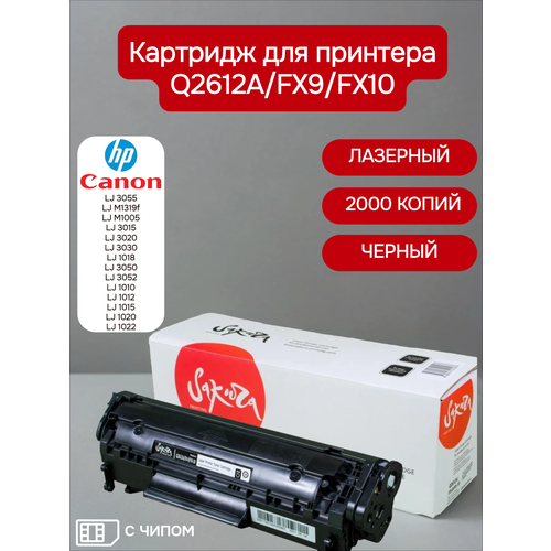 Картридж Q2612A/FX9/FX10 от Sakura – это высококачественный расходный материал для оргтехники, который обеспечивает четкую и яркую печать. Он полностью совместим с принтерами и МФУ HP и Canon, включая модели HP LaserJet 3055, HP LaserJet M1005, HP LaserJet 3015, HP LaserJet 3020, HP LaserJet 3030, HP LaserJet 1018, HP LaserJet 3050, HP LaserJet 3052, HP LaserJet 1010, HP LaserJet 1012, HP LaserJet 1015, HP LaserJet 1020, HP LaserJet 1022, LJ 3055, HP LaserJet M1319 MFP, LJ M1319f, LJ M1005, LJ 3015, LJ 3020, LJ 3030, LJ 1018, LJ 3050, LJ 3052, LJ 1010, LJ 1012, LJ 1015, LJ 1020, LJ 1022.