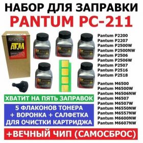 Найти - Набор для 5-х заправок Pantum P2200 P2207 P2500W P2506W P2516 P2518 M6500 M6500W M6506NW M6507 M6507W M6550NW M6607NW PC-211 / PC-211EV (5 флаконов тонера + вечный чип + воронка + салфетка для очистки картриджа)
