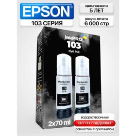 В наборе 2 флакона черного цвет (BK) в вакуумной упаковке по 70 мл каждая. Комплект чернил рассчитан для печати 6 000 страниц А4. Чернила для принтера epson 103 гарантируют отличное качество печати на документах и фотобумаге.