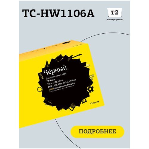 Лазерный картридж T2 TC-HW1106A для принтеров HP, черный (black). Подходит для принтеров: HP Laser 107a, 107r, 107w; HP Laser MFP135a, MFP135r, MFP135w, MFP137fnw. Оригинальный картридж - W1106A