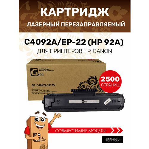 Универсальный совместимый лазерный картридж C4092A/EP-22 (HP 92A) подходит для принтеров HP LaserJet 1100/1100a/3200/Canon Laser Shot LBP-250/LBP-350/LBP-800/LBP-810/LBP-1110/LBP-1120/LBP1110SE. При производстве расходных материалов GalaPrint используются только качественные комплектующие. Картриджи GalaPrint не уступают оригинальным, полностью совместимы с заявленными моделями принтеров, обеспечивают естественную цветопередачу и хорошее качество печати. Важно. Производитель имеет право, не уведомляя заказчика, вносить изменения в конструкцию и комплектацию картриджа, без ухудшения его потребительских свойств. В случае наличия оранжевых транспортировочных фиксаторов, защитных крышек, шторок и чеки/запорной ленты их нужно извлекать. Ресурс картриджа составляет - 2500 страниц формата А4 при 5% заполнении