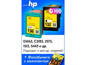 Картриджи для HP 132, 136, HP Deskjet 5443, D4163, Photosmart 2573, C3183, D5163, Officejet 6213, PSC 1513 и др, с чернилами, комплект из 2 шт. 101936010651