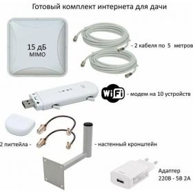 Комплект включает в себя внешнюю антенну 15dBi, модем Wi-Fi и все необходимые аксессуары для установки. Антенна способна улавливать даже самый слабый сигнал интернета на расстоянии до 10 км от базовой станции оператора, обеспечивая стабильное подключение для всех членов семьи и устройств.