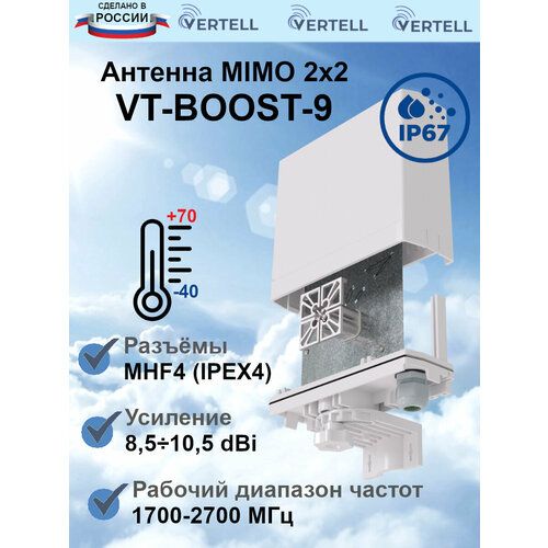 Антенна VT-BOOST-9 MIMO 2x2 в герметичном боксе предназначена для усиления 3G/4G/LTE сетей и размещения внутри антенны встраиваемых модемов, адаптеров или роутеров. Антенна снабжена встроенными пигтейлами MHF4 (IPEX4), что позволяет использовать для размещения встраиваемых модемов, роутеров, переходников Vertell. Степень защиты оболочки IP-67. Ударопрочный.