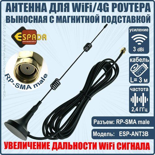 Найти - Антенна 2,4G WiFi для беспроводных устройств, RP-SMA male, усиление 3 db, модель ESP-ANT3B, Espada