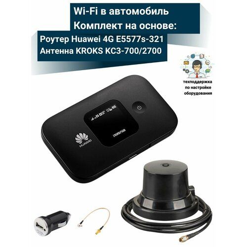 Недорогой комплект для автомобилей на основе портативного роутера Huawei 4G E5577s-321 и магнитной всенаправленной антенны Kroks KC3-700/2700. С помощью роутера вы сможете легко «раздать» мобильный интернет по WiFi в салоне транспортного средства, а выносная антенна поможет усилить сигнал на большом расстоянии от базовой станции.
