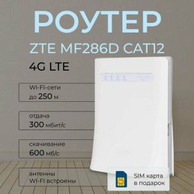ZTE MF286D – мощный 4G LTE роутер категории 12 (CAT.12) со встроенным модемом для передачи данных по каналам 4G LTE/3G/2G. Поддерживает агрегацию частот и скорость загрузки данных до 600 Мбит/с в 4G/LTE сетях. Зона покрытия Wi-Fi-сети – до 200 - 250 метров. Прекрасно подходит для организации точки доступа к беспроводному высокоскоростному интернету. Дополнительно имеется 4 Ethernet порта для возможности использования проводного подключения. Со временем менее известные компании догоняют крупных, создавая продукты, которые в некоторых аспектах превосходят крупные бренды. Именно так обстоит дело с этим роутером - ZTE MF286D . На рынке есть несколько версий модели MF286 — именно версия с буквой D на конце самая быстрая. Вся серия работает стабильно и имеет очень похожий внешний вид, но на практике различия между ними существенны. Этот роутер может создавать 3 параллельных подключения к передатчику при загрузке, что позволяет получить удовлетворительные скорости даже при его сильной загрузке. Если вы живете в месте с плохим покрытием, вы можете использовать два антенных разъема на его задней панели, чтобы улучшить его. Кроме того, роутер оснащен беспроводной сетью, работающей в стандарте AC1200 с функцией Band Steering — подробности в описании. Wi-Fi имеет заводскую защиту. Домашний роутер с SIM-картой ZTE MF286D имеет высокую категорию LTE, стабильно работает, поддерживает новейшие технологии беспроводной сети и при этом стоит не дорого по сравнению с другими с аналогичными параметрами. ZTE MF286D — домашний роутер со встроенным модемом LTE-A . Позволяет раздавать интернет с одной симки на несколько устройств одновременно. Роутер не имеет блокировки SIMLock — он работает в любой сети и на любой частоте , доступной на данный момент в России. Встроенный модем LTE относится к категории 12. Это означает, что он может одновременно использовать три частоты LTE . Максимальная скорость может быть: скачивание - до 600 Мб/с отдача - до 150 Мбит/с Антенные разъемы На задней панели есть два антенных разъема SMA. Они используются для усиления принимаемого сигнала мобильного интернета. Антенны Wi-Fi встроены.