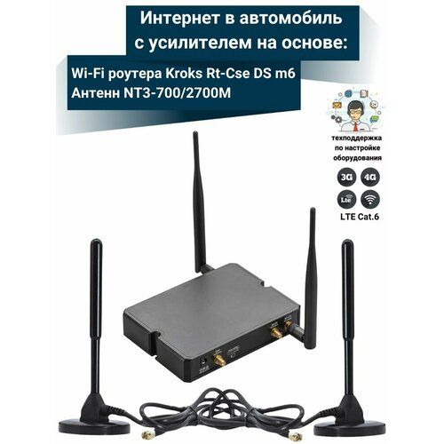 Готовый комплект для усиления 3G и 4G интернета в движущемся транспортном средстве любого типа. Автомобильный набор включает в себя 2 уличные всенаправленные антенны NT3-700/2700M, современный и надежный роутер Kroks Rt-Cse DS m6 с 4G модемом LTE cat.6, две SIM-карты, до 300 Мбит/с со встроенным WiFi-модулем и поддержкой стандартов мобильной связи третьего и четвертого поколений, 2 салонные WiFi-антенны.