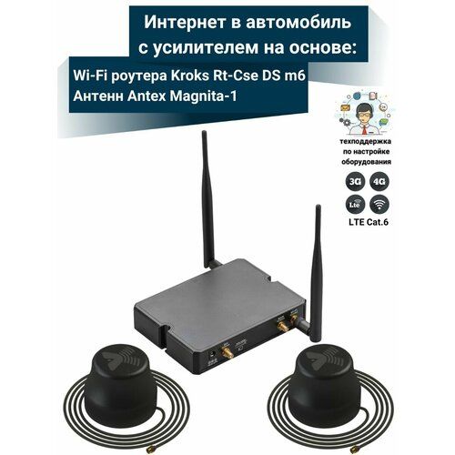 Готовый комплект для усиления 3G и 4G интернета в движущемся транспортном средстве любого типа. Автомобильный набор включает в себя 2 уличные всенаправленные антенны Antex Magnita-1, современный и надежный роутер Kroks Rt-Cse DS m6 с 4G модемом LTE cat.6, две SIM-карты, до 300 Мбит/с со встроенным WiFi-модулем и поддержкой стандартов мобильной связи третьего и четвертого поколений, 2 салонные WiFi-антенны.