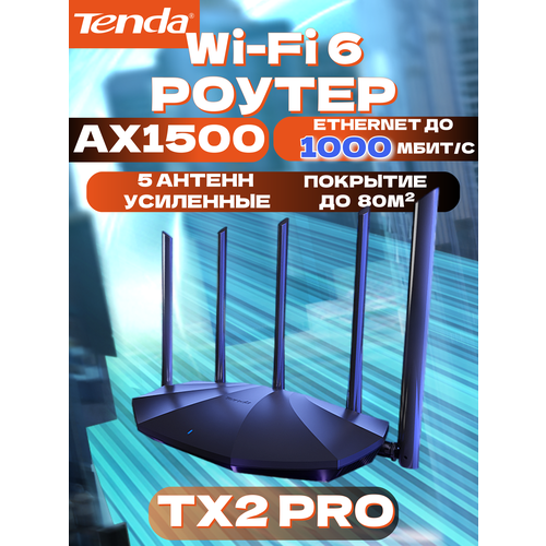 Tenda Wi-Fi 6 Роутер TX2 Pro, Гигабитный, AX1500, интернет до 1000 мбит/с, Wi-Fi+(Mesh Система),80MHz, двухдиапазонный 1793397047