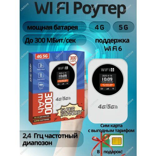 мобильный вай фай, что делает его незаменимым помощником в поездках, командировках и на даче. Мини Wi fi модем нового поколения имеет новейшую технологию WiFi - 5G, аккумулятор на 3000мАч и 10 часов работы без подзарядки 300 часов в режиме ожидания.
