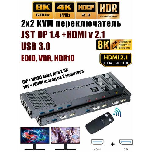 DP 1.4 +HDMI 2.1 KVM-переключатель, вход 2 компьютера, выход на 2 монитора, .