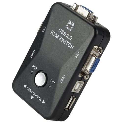 KVM-переключатель позволяет подключить дисплей VGA и до трёх USB-устройств (мышь, клавиатура, внешний диск, принтер и прочее) к двум компьютерам, используя их поочередным переключением с помощью кнопки.Характеристики:Поддержка разрешения: 1920*1440Версия USB: 2.0Количество портов USB для внешних устройств: 3Управление переключением: кнопка на устройствеНе требует дополнительной установки, Plug&PlayНе требует дополнительного источника питания.Необходимое дополнительное оборудование (при полной загруженности всех портов): Кабель USB A-B - 2шт (для передачи данных и питания от компьютеров) Кабель VGA - 3шт (2шт для подключения компьютеров, 1шт для вывода на дисплей). Если в подключении экрана нет необходимости, кабели VGA можно не использовать.
