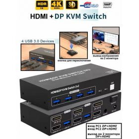 Найти - КВМ Переключатель на 2 Монитора KVM Switch HDMI-DP-USB поддержка 4К/60HZ, HDMI 2.0, DP 1.2, USB 3.0