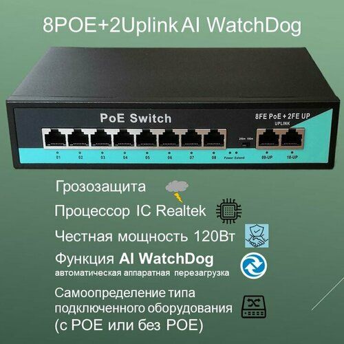 Найти - Коммутатор YDA POE 8POE+2Uplink,100 Мбит/с, WatchDog+VLAN, 250 метров,120 Ватт, процессор IC REALTEK