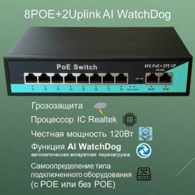 POE коммутатор 8 POE+ 2 Uplink портов, неуправляемый. Свитч имеет скорость портов POE 100 Мбит/с, солидный бюджет мощность 120 Ватт, максимальная мощность на 1 порт составляет до 30 Ватт. Ключевая особенность данного коммутатора- это система WatchDog (аппаратная перезагрузка порта, на котором произошло зависание IP оборудования). Дальность передачи питания о обмена данных в нормальном режиме составляет 100 метров, в режиме EXTEND до 250 метров + изоляция портов VLAN. Коммутатор в автоматическом режиме определяет тип подключенного к нему оборудование с POE или без POE. Данные коммутаторы производятся на топовых процессорах REALTEK. Коммутатор поддерживает протоколы IEE802.3at/af. Напряжение на портах POE 48 Вольт, блок питание встроенный с защитой от перенапряжения, грозозащита.