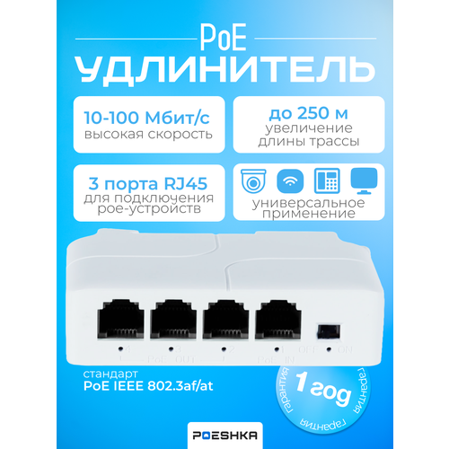 PoE коммутатор сетевой удлинитель поможет создать эффективную сетевую инфраструктуру, увеличив длину трассы до 250 метров. Скорость до 100 Мб/с, целых 3 порта RJ45, установка до 100 метров от источника PoE, усиление сигнала, подключение до 3-х устройств, режим увеличения расстояния передачи данных, соответствие стандарту IEEE 802.3AF/AT Power over Ethernet, возможность установки на DIN рейку и гарантия на целый 1 год позволили создать идеальное оборудование для быстрого расширения сети видеокамеры, IP камеры видеонаблюдения, ipкамеры наблюдения, беспроводные точки доступа, роутеры, ноутбуки, компьютеры, ip телефон и многое другое.
